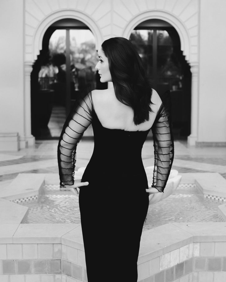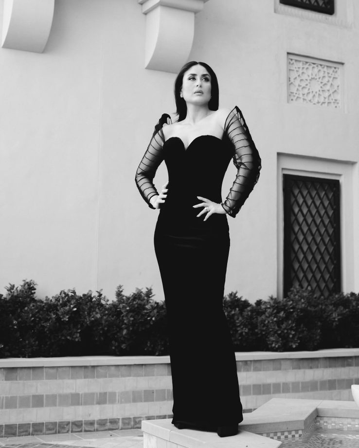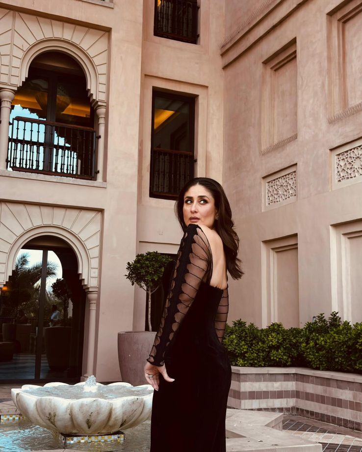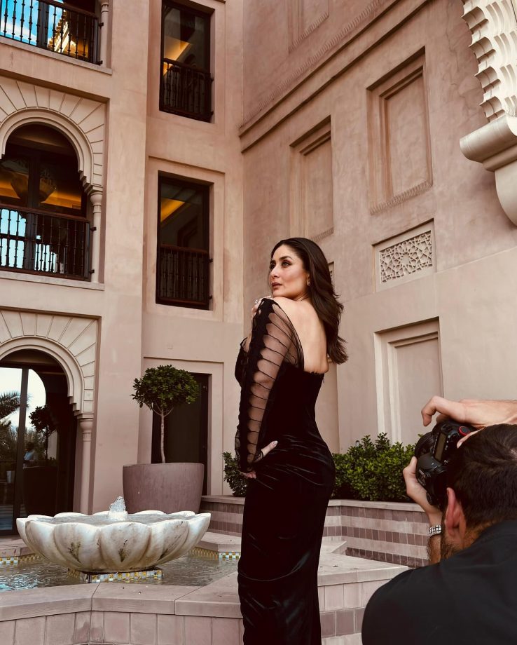 At 45, Kareena radiated timeless elegance, flaunting her toned shoulders and sculpted frame. The sleek, straight-cut back added a modern edge, while the cocoon-style noir sleeves brought a sense of high-fashion drama. The sheer fabric of the sleeves added a delicate contrast, striking the perfect balance between grace and allure.