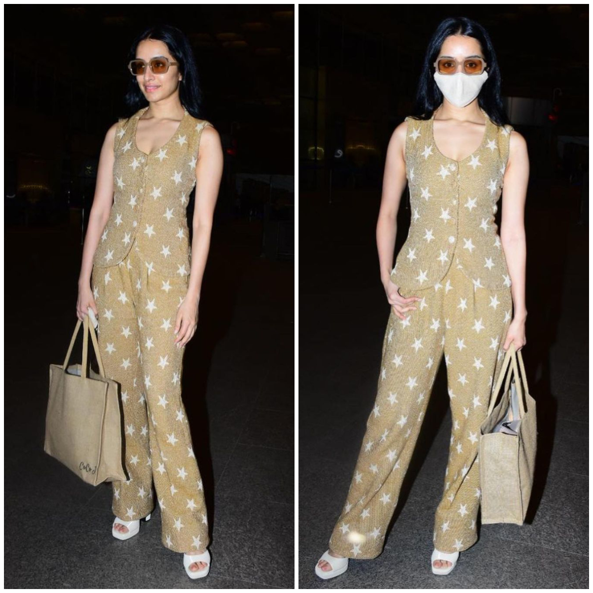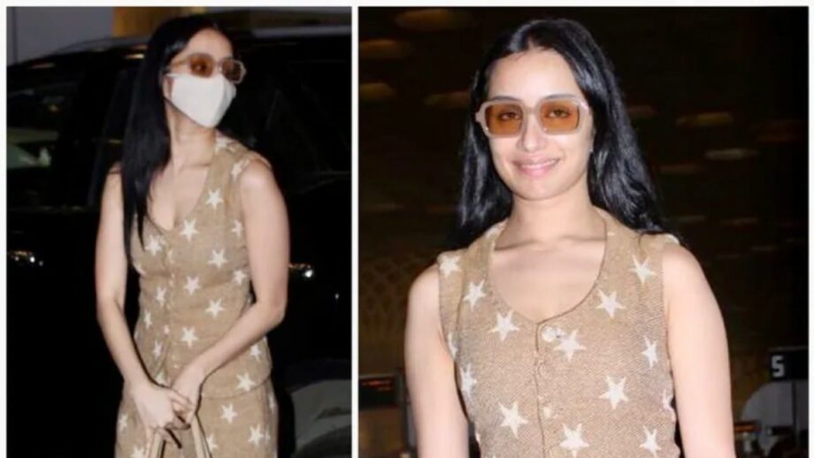 Shraddha was clad in a shimmery yet simple co-ord set from Sheena Trehan. The finished cotton jacquard set worth Rs 9000 highlighted a fitted upper sleeveless coat and wide-legged pants acing the star print on print attire perfectly. Her coat bore a scooped neck area and scalloped fix. It was certainly a head-turner because of the striking and white star prints on it. Shraddha clubbed the brilliant look with brown-coloured stylish shades from The Tinted Story and beige toned square heels from Zara. She conveyed a matching earthy coloured handbag and kept her look flawless. The actress swooned in the perfect comfortable look for her travel, along with minimal makeup look.