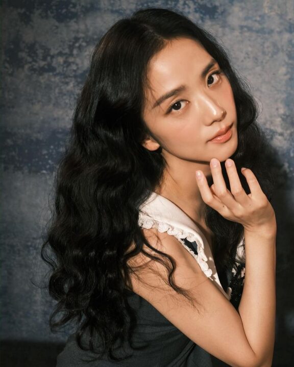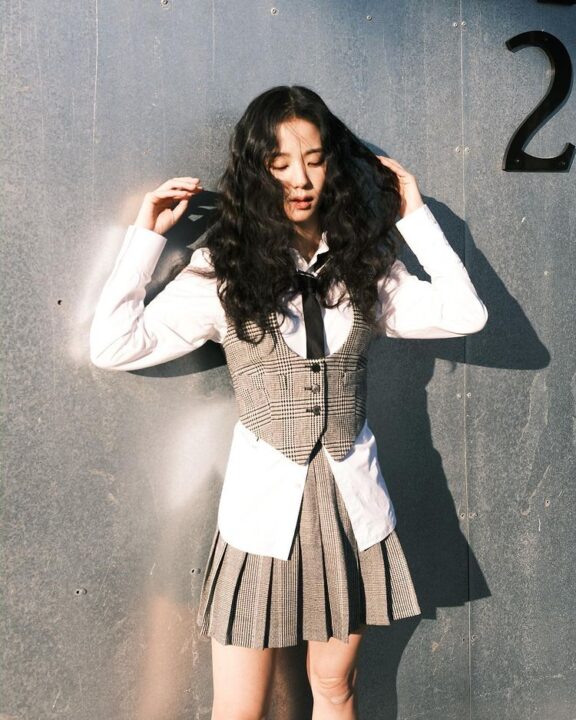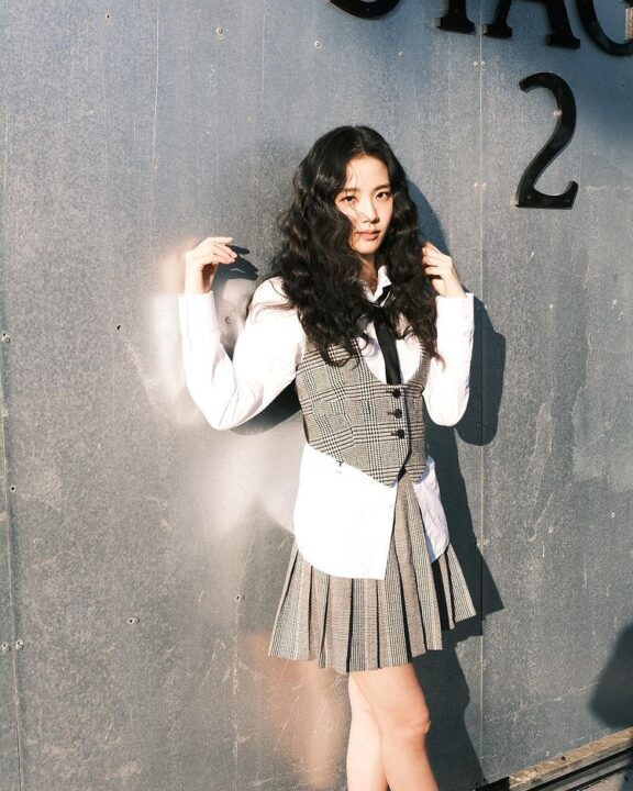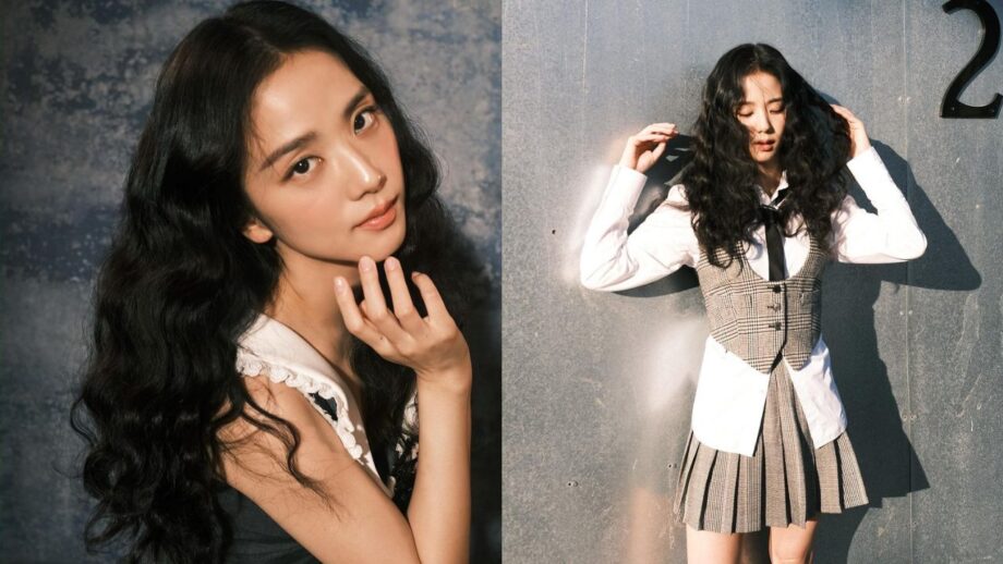 The singer shared a photoshoot series on her social media handle. We can see her wearing a long white shirt. She topped it with a grey and white mini-checkered waist coat. She further teamed the look with checkered matching pleated midi skirt. Amping it up with a black tie, minimal makeup and gorgeous long curls, the diva swelled up with too much cuteness in the photographs. Going all sunkissed, Jisoo went on sharing some more pictures that captured her different moods.