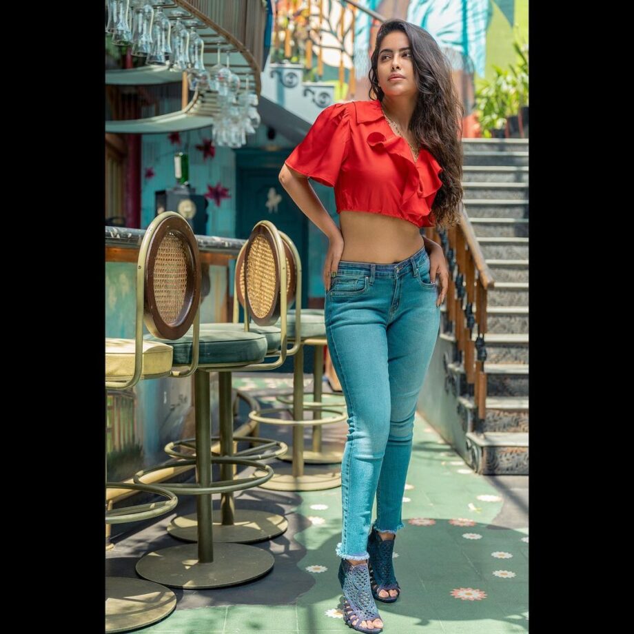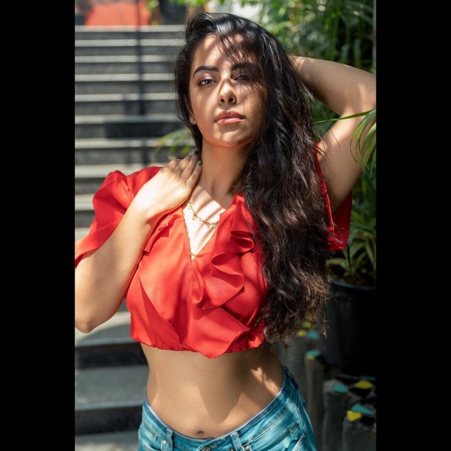 2) Avika Gor’s sultry looks in a funky red crop top and skin-fit denim paired with blue heels and open hair. See pics