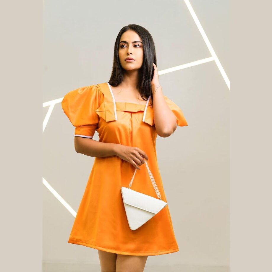 1) Avika Gor in a bright orange mini dress along with a white cute handbag and rosy lips inspiring for a clean elevated look. See pics