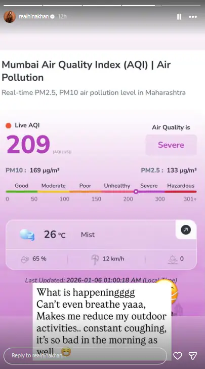 Recently, Yeh Rishta Kya Kehlata Hai actress Hina shared a screenshot of Mumbai’s air quality index, raising concerns over the deteriorating air quality. She also emphasized that the poor air quality had started to affect her life, leading to breathing difficulties and a constant cough.