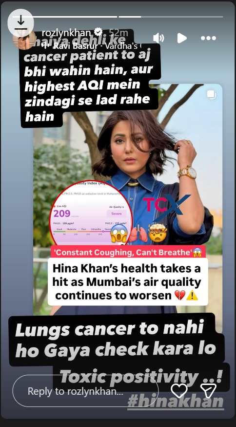 Just a day after Rozlyn re-shared the news posted by a media house on her Instagram and took a harsh jibe at Hina, asking if Hina had been diagnosed with Lung Cancer in sarcasm. She wrote, “Bhaiya Dehli cancer ke cancer patient to aj bhi wahin hain, aur highest AQI mein zindagi se lad rahe hain.”